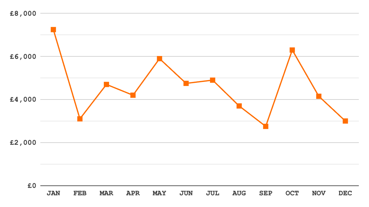 (Amounts are gross revenue before taxes, in GBP, and they counted in the month when the work was performed, not when I received the payments.)