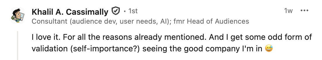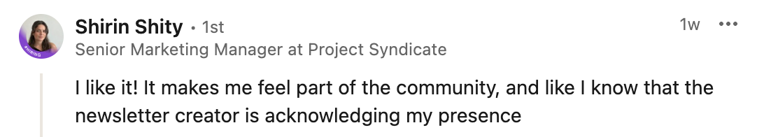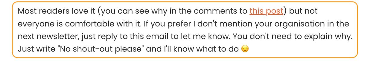 It was also the subject of a recent conversation I had with someone who was curious to know how readers (that would be you) react to being publicly welcomed as new subscribers through the name of the company/organisation they work for.