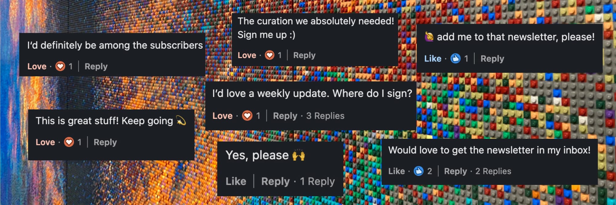 For a few weeks, I tested the idea on LinkedIn, asking people there if they were interested in receiving a curation of links like these directly in their inbox. Their answer โ your answer! โ was loud and clear:
